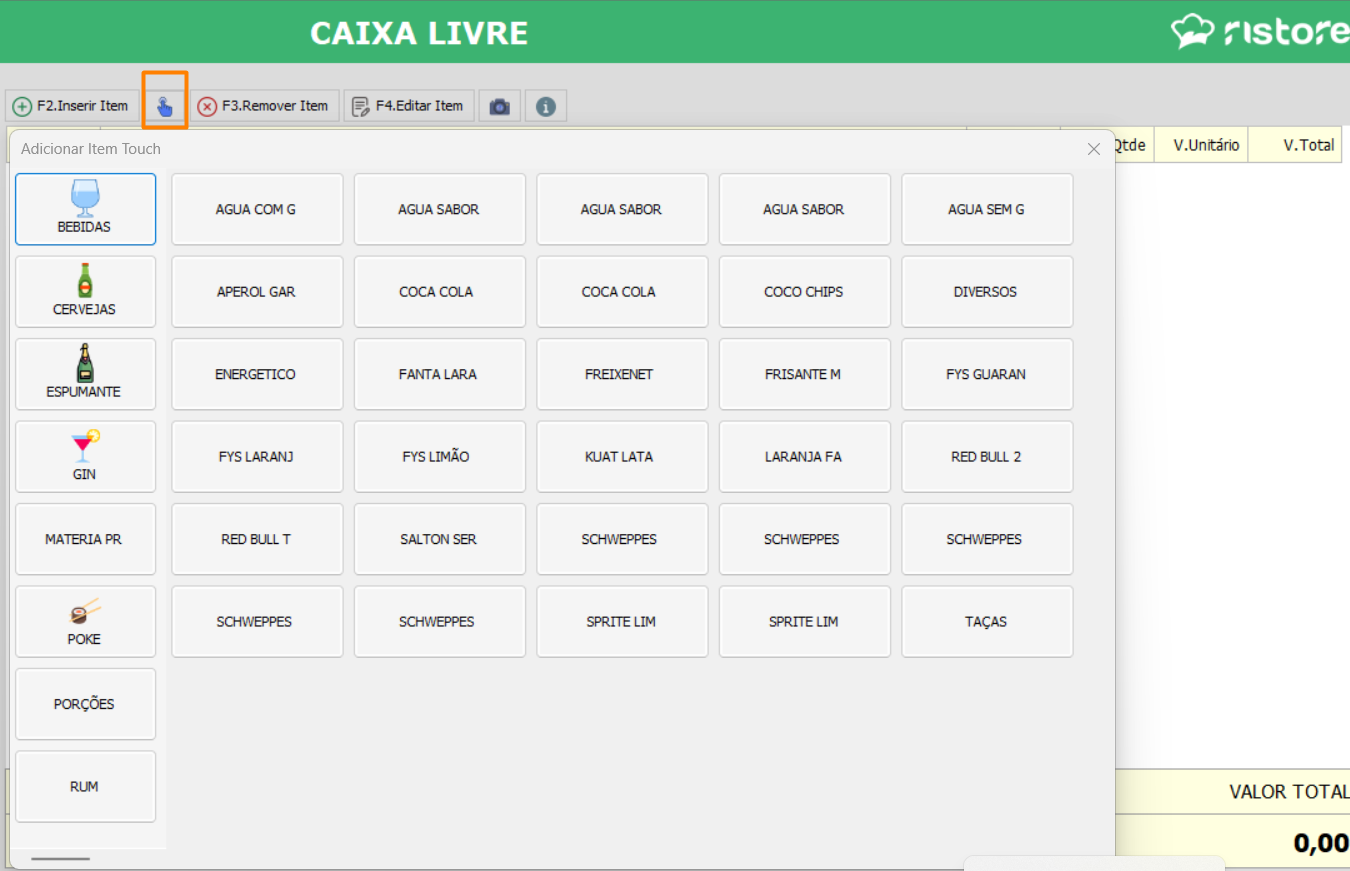 * **Botão icone touch** - simula a venda touch possibilitando acesso rápido pelo grupo do produto.