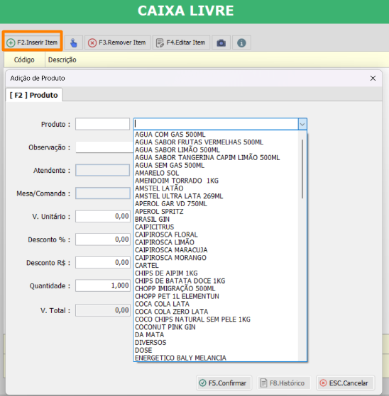 * **F2 Inserir Item** - clicando ou pelo atalhdo do teclado abre janela de busca do item.
