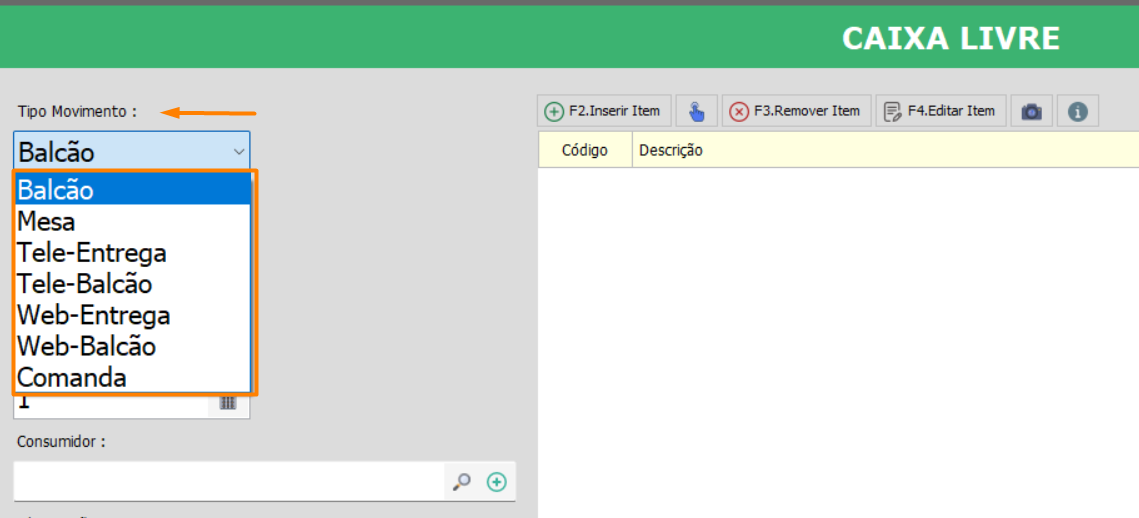 <figure><img src="https://3778271354-files.gitbook.io/~/files/v0/b/gitbook-x-prod.appspot.com/o/spaces%2F-Lyow7NOSTkluV_nGWio%2Fuploads%2FTkAsZxygEwpVCwVBPE5T%2Ftipo%20movimento.png?alt=media&#x26;token=fa9a16d1-8ccc-45f9-9e09-e8133650dafc" alt="" width="563"><figcaption><p>Tela vendas - campo tipos de movimentos.</p></figcaption></figure>