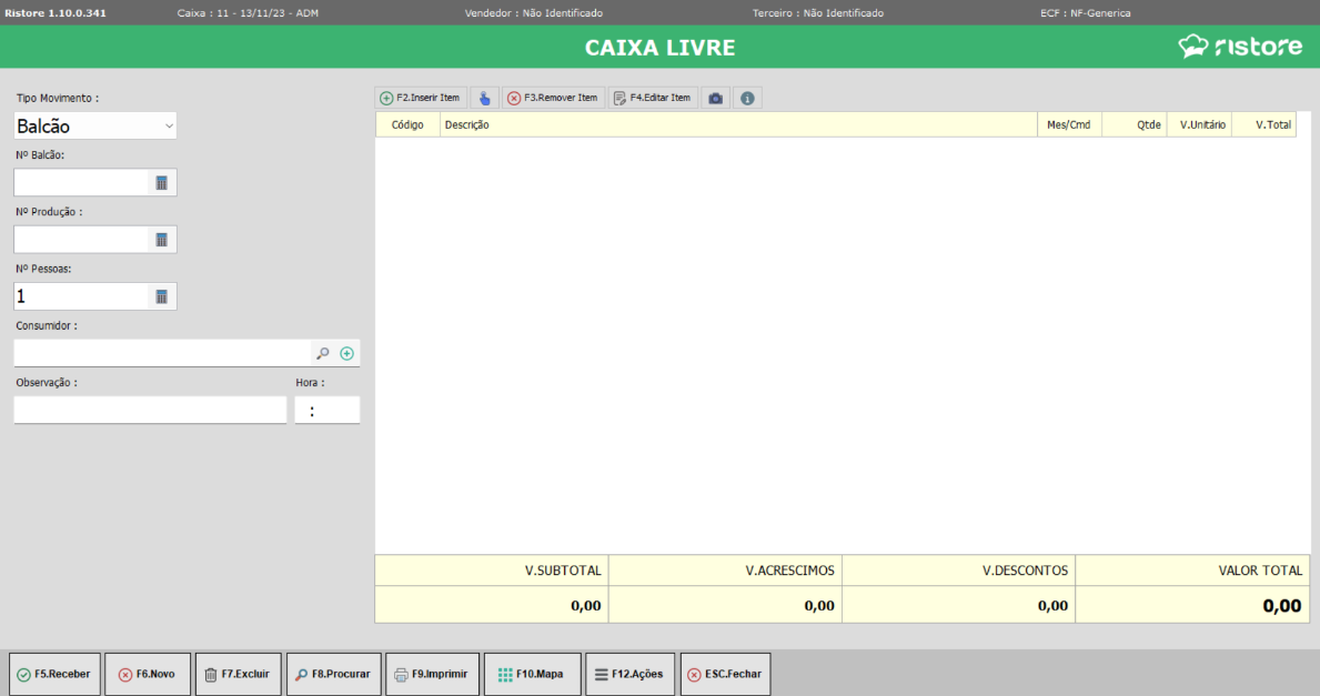 * **F6 Novo** - clicando no botão ou na tecla de atalho **F6** limpa a tela da venda atual e realiza a impressão do item inserido no local de impressão.